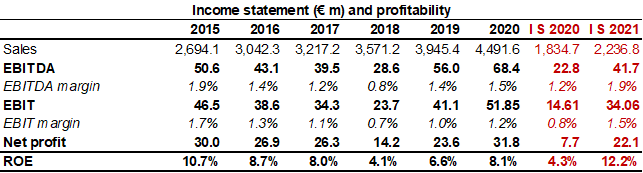 Il 6 settembre la società ha reso noti gli ottimi risultati del primo semestre 2021, con i ricavi in aumento del 22% rispetto al corrispondente periodo 2020 e l’utile a +187%. Il cash conversion cycle è crollato a soli 9 giorni rispetto ai 23 di fine 2019.