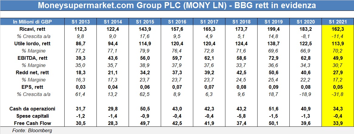 Tra i titoli segnalati dalla rubrica, MONEYSUPERMAKET rappresenta una delle due azioni ad aver presentato una variazione negativa del prezzo. Analizziamo, pertanto, i conti del primo semestre nel tentativo di comprendere la validità delle ragioni che avevano suggerito la segnalazione.