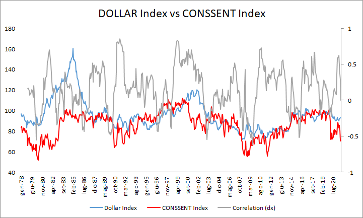 Di seguito, il grafico mostra il rapporto tra il Dollar Index e il CONSSENT Index, nonché un calo della correlazione dopo il recente test di +0.60.
