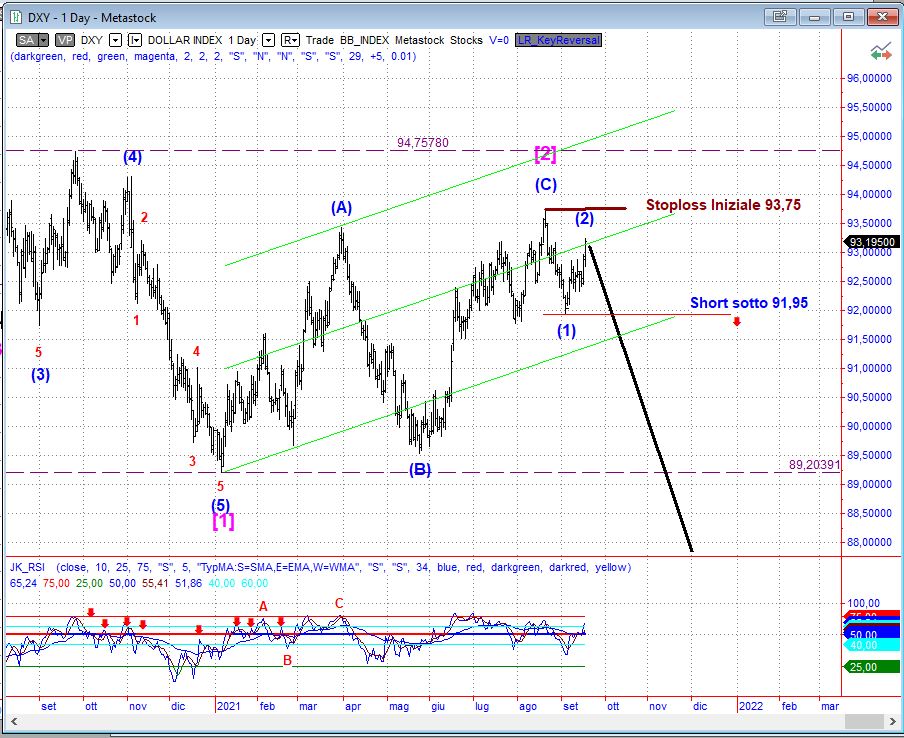 L’onda [3] ribassista sul Dollar Index non era iniziate e il rialzo di questa settimana sul Dollaro ha prodotto un’onda (2) con una migliore suddivisione. A questo punto il ritracciamento di onda (1) ha superato il 61,8% portandosi quasi a ridosso del 76,4%. A questo punto se non è conclusa è agli sgoccioli. Solo una rottura al rialzo del massimo di onda [2] potrebbe sovvertire il nostro quadro tecnico. Se abbiamo ragione presto il dollaro dovrebbe riprendere la strada del ribasso con un’onda (3) di [3] che si preannuncia pesante.