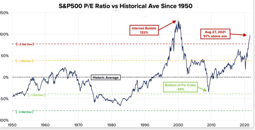Le valutazioni sono ormai stellari e ci stiamo dirigendo verso i massimi della bolla internet del 2000. Nella figura seguente trovate la media storica (linea tratteggiata nera in corrispondenza dello 0%) e potete notare come ci stiamo trovando ormai BEN OLTRE le DUE deviazioni standard.
