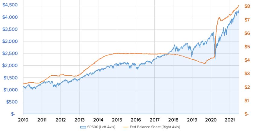 Interessante poi notare un vecchio grafico che avevo postato l'anno scorso a marzo in piena pandemia, quando sostenevo come molto probabile ed imminente una inversione del mercato causata proprio dal Balance Sheet della Federal Reserve, facendo notare tutta la massa di liquidità che avrebbe inondato i mercati (sostenendone così i corsi delle azioni). Nel grafico seguente troviamo l'espansione del bilancio della Fed all'inizio del 2020 e notiamo che si allinea molto chiaramente al crollo dell'S&P500 ed alla sua successiva ripresa. Ciò suggerisce che l'economia non sta effettivamente andando così bene come suggeriscono le Borse (o l'S&P500) e solleva serie preoccupazioni sulla sostenibilità dell'attuale performance del mercato azionario.