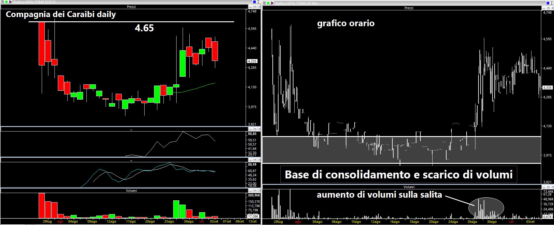 Azione tendenzialmente illiquida ma nell'ultima settimana si è diretta verso i massimi storici dal collocamento posti a 7.80 euro con volumi medi giornalieri attorno ai 20 mila pezzi (rispetto alle poche migliaia del periodo giugno-luglio). Sul settimanale sta rientrando in un canale rialzista (linea tratteggiata) mentre sul daily abbiamo una fascia supportile posta attorno a 7.00/7.20 euro che costituisce anche un'area di stop. Ideale un consolidamento attorno a 7.30/7.40 per poi attaccare i massimi e ridurre così lo stop dal punto di ingresso.