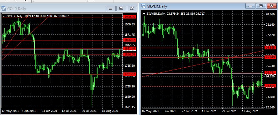 Di seguito trovate il grafico dell'oro (a sinistra) e del silver (a destra), entrambi su un timeframe daily. Attenzione che l'oro si trova esattamente sul livello indicato sabato scorso e posto a 1832 dollari che penso bucherà velocemente (vedremo come si comporterà mano a mano naturalmente).