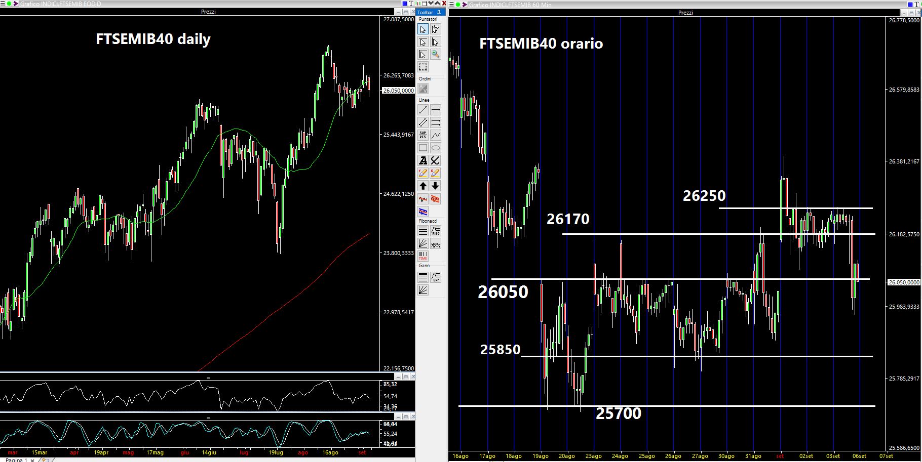 Notiamo subito che la settimana si è "giocata" attorno al livello di 26170 che ha costituito una discreta resistenza martedì, divenuta poi supporto nelle sedute successive salvo essere rotto al ribasso nella giornata di mercoledì e di venerdì. Esito settimanale? Nulla di fatto! Purtroppo il nostro indice e più in generale quelli europei non riescono assolutamente a brillare di luce propria nemmeno con i rialzi incessanti di Wall Street (e vedremo se dalla prossima settimana post Labor Day inizierà una correzione). Attenzione anche al fatto che mancano completamente i volumi e questo è un pò un paradosso dal momento che c'è veramente tantissima liquidità.
