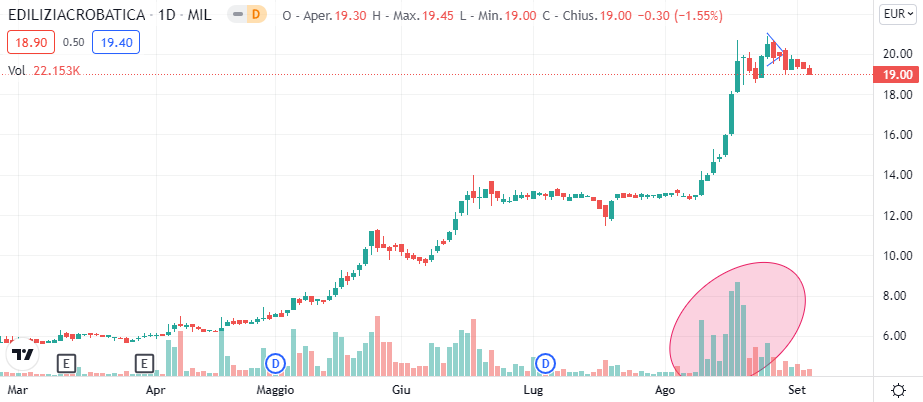 AZIONI EDILIZIACROBATICA: Dopo la chiusura del triangolo che avevamo segnalato la scorsa settimana nell'articolo ha preso il via una discesa che assomiglia sempre di più all'inizio di una congestione e quindi non c'è da preoccuparsi. I volumi hanno seguito il flusso e come vediamo sono diminuiti insieme ai prezzi segnalando che non ci sono poi troppe vendite. Se si guarda indietro, il titolo non può che essere soddisfatto: nel mese di agosto i prezzi sono aumentati di oltre il 70%. Ediliziacrobatica ha chiuso il primo semestre del 2021 con ricavi che superano i 37 milioni, in aumento di ben il 113,3% rispetto allo stesso periodo dello scorso anno.