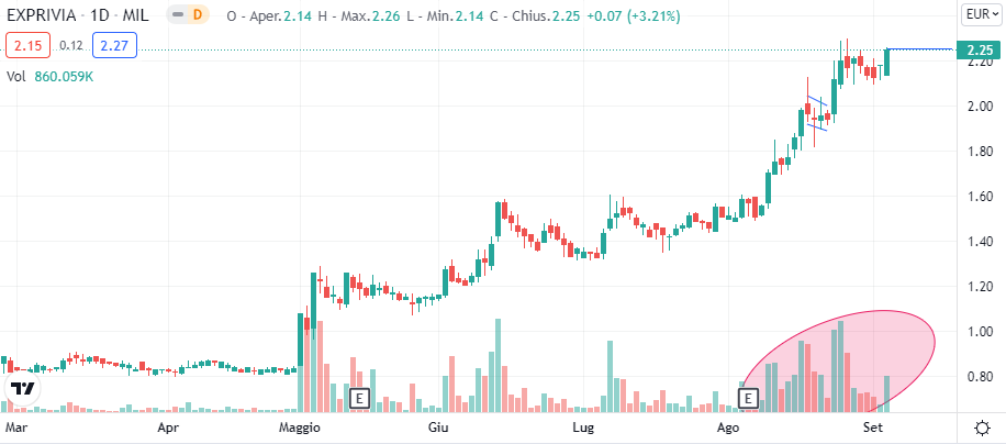 AZIONI EXPRIVIA: Aumento di prezzi del 171,1%, da maggio a oggi, per azioni Exprivia, che sebbene non abbiano una capitalizzazione particolarmente interessante hanno fatto un salto che merita di essere segnalato. Prezzi e volumi impazziti in estate, anche grazie a risultati finanziari più che rassicuranti. La società, attiva in information e communication technology, ha chiuso i primi sei mesi dell'anno con ricavi per 84,8 milioni di euro (+4%) e un Ebitda di 11,54 milioni (+47,8%). il risultato finale è stato positivo per 4,46 milioni di euro rispetto al rosso contabilizzato nel primo semestre 2020.