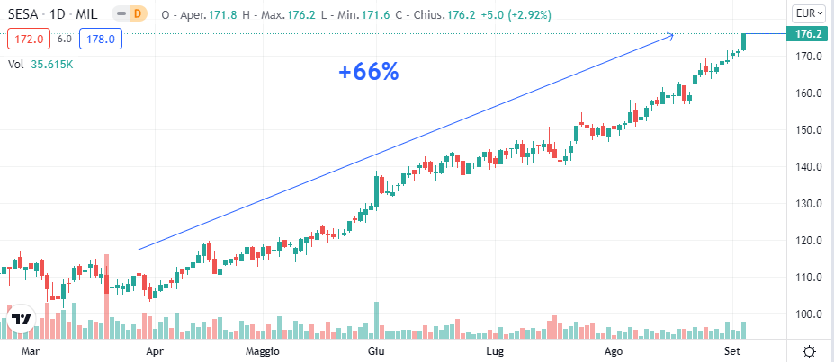 AZIONI SE.SA: E' uno dei nostri titoli migliori. I prezzi da aprile a oggi sono aumentati di circa il 66%, arrivando anche, nella seduta di venerdì, a rompere i massimi storici. Peccato per i volumi che potrebbero performare meglio. Il gruppo a fine aprile ha chiuso il bilancio 2020/2021 con ricavi di 2,04 miliardi di euro (+14,7%) e l'Ebitda a 126 milioni di euro (+33,4%).