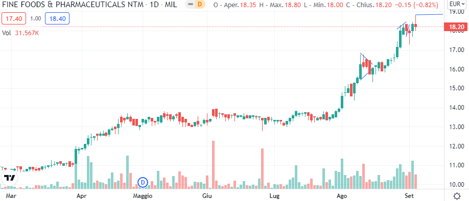 AZIONI FINE FOODS & PHARMACEUTICALS: Rottura dei massimi anche per azioni Fine Foods & Pharmaceuticals, con la situazione che rimane simile a quella di azioni Reply. Dopo un inizio estate magro di volumi, la situazione si è ripresa a fine luglio e adesso anche questi appaiono costanti e abbondanti. Da gennaio i prezzi sono aumentati dell'80%. L'azienda ha chiuso il 2020 con ricavi di 172 milioni, in crescita dell'8% rispetto al 2019.