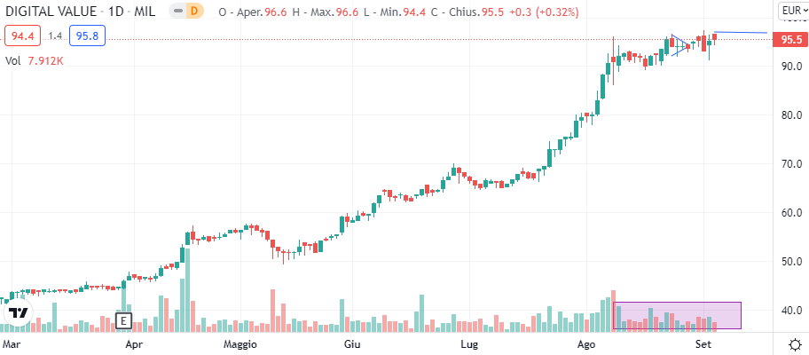 AZIONI DIGITAL VALUE: Anche in questo caso la previsione della scorsa settimana si è dimostrata corretta e il titolo, seppur in un momento di stallo, si è alzato fino a rompere i massimi. I prezzi attualmente sfiorano i 95,5 euro segnando un aumento, da inizio anno, del 151%.