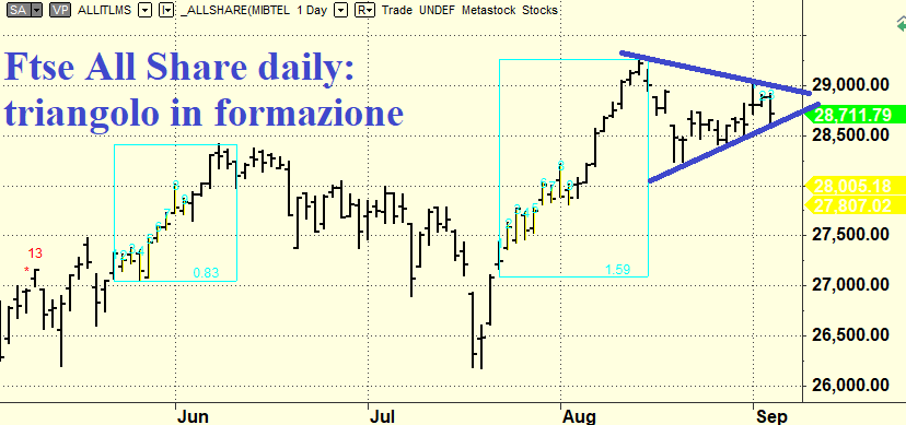 Ci siamo: il mercato non ha ritracciato. Se guardate il grafico qui sotto dell'indice Ftse All Share noterete come i prezzi dell'indice sono rimasti vischiosi e non si sono mossi rispetto al punto di rottura. Significa solo una cosa: sono più quelli che comprano a quei prezzi di quelli che vendono. Il rischio era di vedere una fuga degli investitori che sfruttando i prezzi sul massimo degli ultimi 10 anni vendevano a man bassa facendo crollare repentinamente i prezzi. Così non è stato. Dopo lo shock iniziale nel vedere lo strappo fino al massimo gli investitori hanno iniziato a comprare e hanno continuato a comprare. Morale: aspettiamoci un ulteriore strappo al rialzo nei prossimi giorni.
