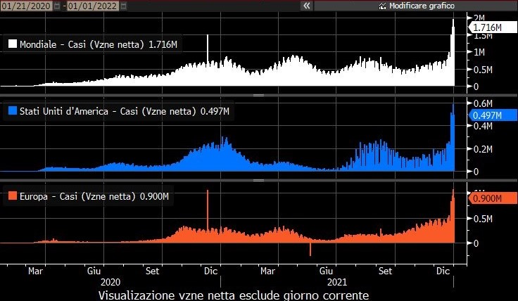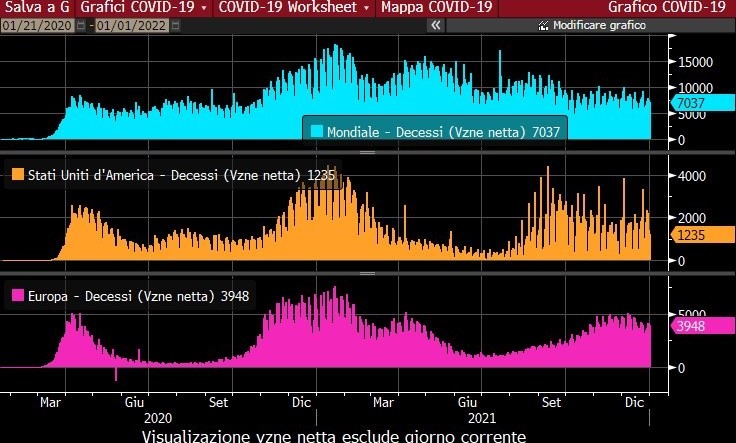 Si è da poco concluso anche il 2021, altro anno decisamente particolare: l’economia mondiale ha evidenziato interessanti segnali di risveglio ma l’emergenza Covid-19 non è ancora stata risolta. Proprio in questi giorni stiamo assistendo ad un’ondata record di contagi: la variante Omicron sta dilagando, ma per fortuna, al momento, il sistema sembra reggere. Dai grafici proposti qui di seguito emerge che, pur a fronte di un notevole incremento dei casi, i decessi (seppur numerosi) non sono cresciuti nella stessa proporzione.