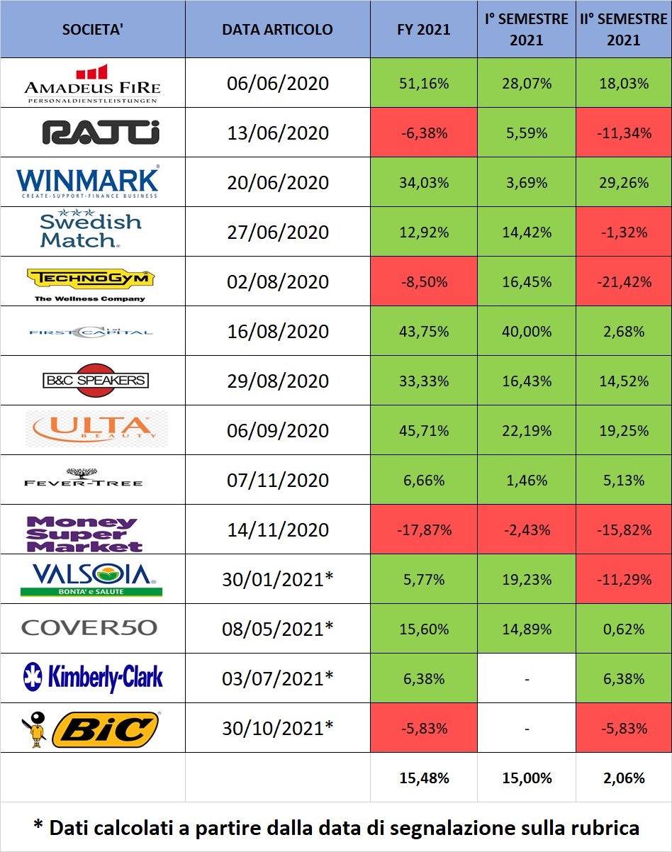 Escludendo gli effetti valutari ed i dividendi, nel 2021, le segnalazioni della strategia hanno generato un apprezzamento del +15,48%: tale risultato è stato realizzato quasi interamente nel primo semestre. La seconda parte dell’anno ha evidenziato una sostanziale parità (+2%).