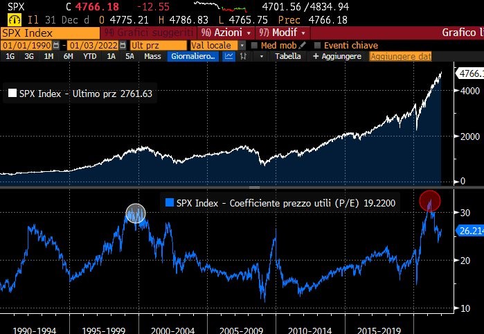I mercati azionari si presentano quasi tutti in prossimità dei massimi, ma sotto il profilo della valutazione, non evidenziano (ancora) livelli di eccesso visti in passato. Nel grafico che segue, a titolo esemplificativo, è riportato in alto l’andamento dello S&P 500 mentre in basso è evidenziato il trend del P/E dell’indice.