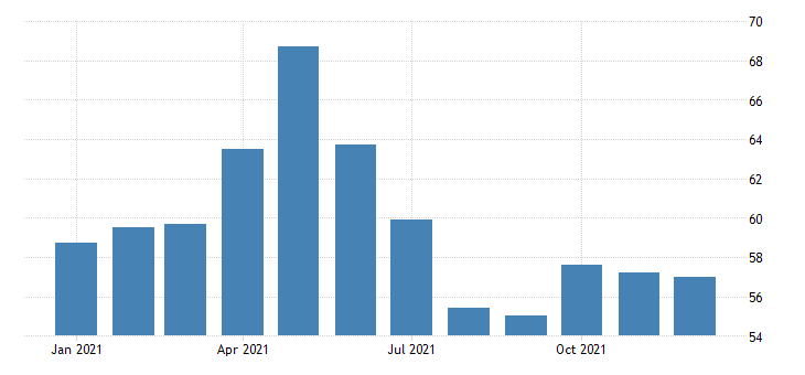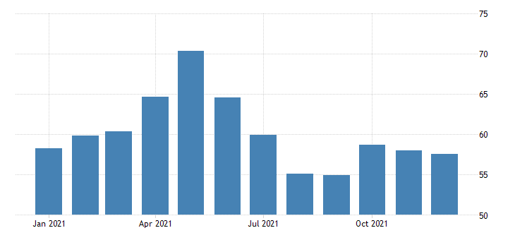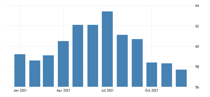 Il PMI relativo al settore dei servizi, elaborato da Markit Economics, a dicembre si attesta a quota 57,6 punti, segnando un lieve calo rispetto ai 58,0 punti di novembre. Il dato preliminare di dicembre era pari a 57,5 punti.