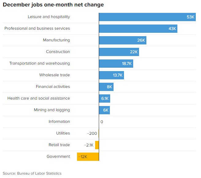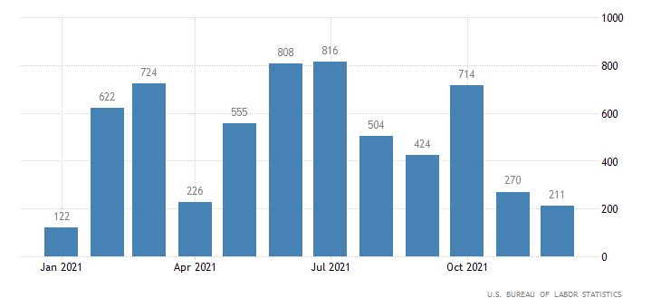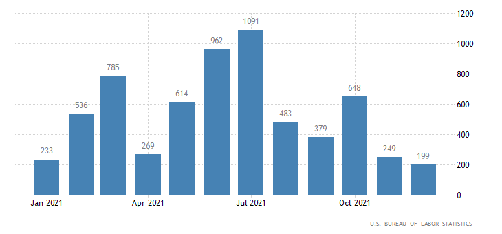 Delusione sui dati occupazionali di dicembre con la nazione alle prese con una massiccia ondata di contagi. Nel settore non-agricolo sono stati creati solamente 199 mila posti di lavoro, un dato che evidenzia un rallentamento rispetto a novembre, quando i nuovi posti di lavoro erano stati 249 mila (numero rivisto da 210 mila). Il dato di dicembre è rimasto ampiamente sotto al consensus, fissato a 400 mila.