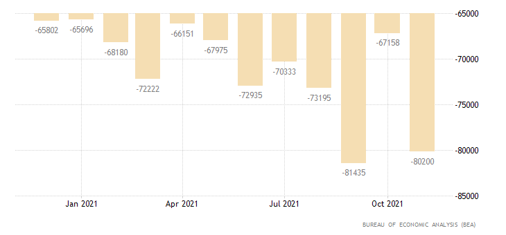 La bilancia commerciale di beni e servizi (differenza in valore monetario tra importazioni ed esportazioni di beni e servizi di una nazione) nel mese di novembre segna un -80,2 miliardi di dollari, contro un consensus di -77,1 miliardi ed un dato di ottobre di -67,2 miliardi (rivisto da -67,1 miliardi). Il dato è rilasciato dal Bureau of Economic Analysis.