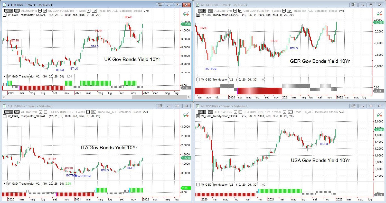 Osservando – a livello di analisi integrata – le curve dei rendimenti dei principali benchmark decennali (Fig.3), il quadro si mostra in rapida evoluzione su tutte le aree valutarie, con importanti allargamenti dei rendimenti sui benchmark decennali. Al momento, il nostro modello Trendycator non ha ancora segnalato variazioni, ma la dinamica dei grafici suggerisce che potremmo essere ad una svolta a livello strategico, rispetto al mese scorso. D’altra parte, già nella scorsa analisi mettevamo in evidenza come potesse essere lecito attendersi una risalita dei rendimenti, in base all’orientamento delle Banche Centrali, FED in testa a tutte.