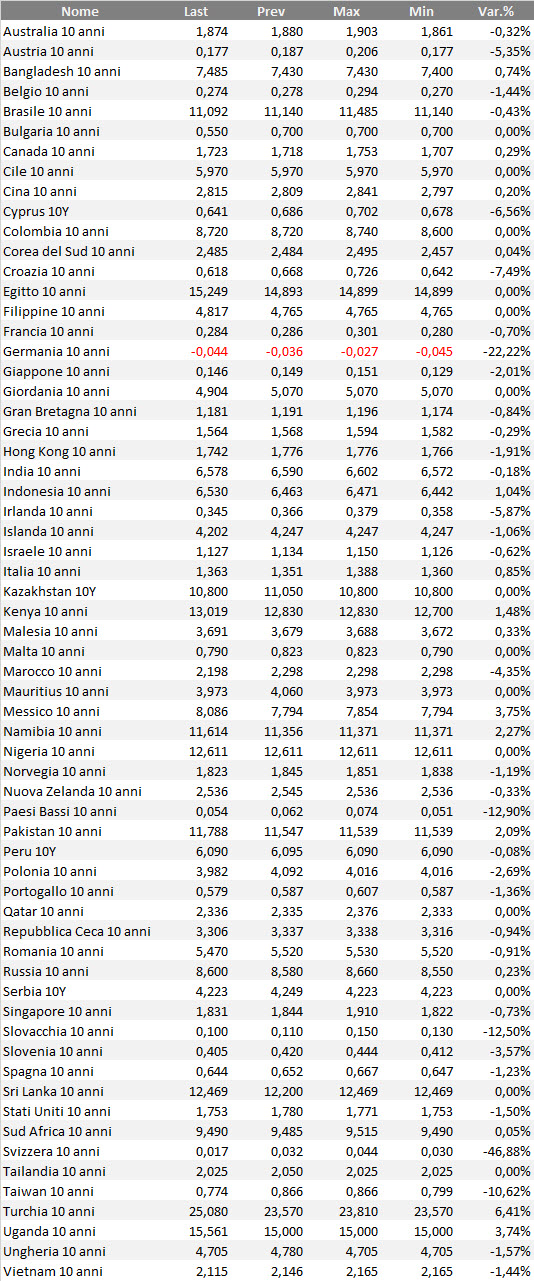 Sezione dell’analisi sui mercati obbligazionari, con l’introduzione sotto forma di ranking dei bond governativi mondiali con qualunque rating. In alcuni casi, per alcuni emittenti o per alcune valute, il rapporto rischio/rendimento di questi bond può essere anche piuttosto speculativo. Il ranking considera i bond benchmark decennali in tutte le valute di emissione.