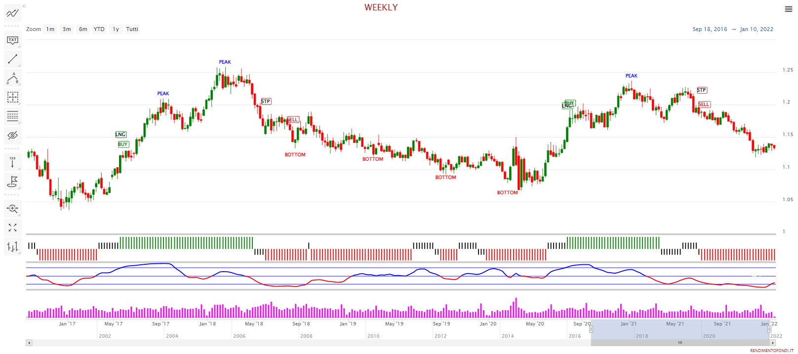 Il modello Trendycator, sempre ben impostato su SHORT, indica che la fase di consolidamento sul cambio EUR/USD tra 1,12 e 1,14 non è ancora terminata, con possibili allunghi sino a 1,15 diventato ora forte resistenza. L’obiettivo, alla ripresa del trend a favore del dollaro contro euro, è sempre l’area 1,06-1,05 che identifica importanti minimi di medio e lungo termine.