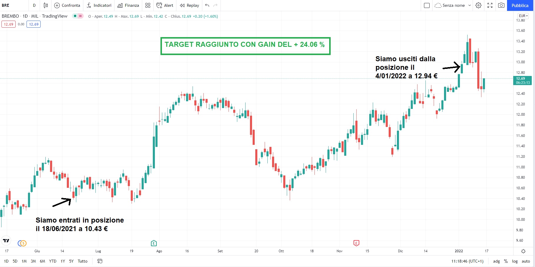 Siamo entrati in acquisto il giorno 18/06/2021 a 10.43 € e abbiamo liquidato la posizione lo scorso 4/01/2022 a 12.94 €.