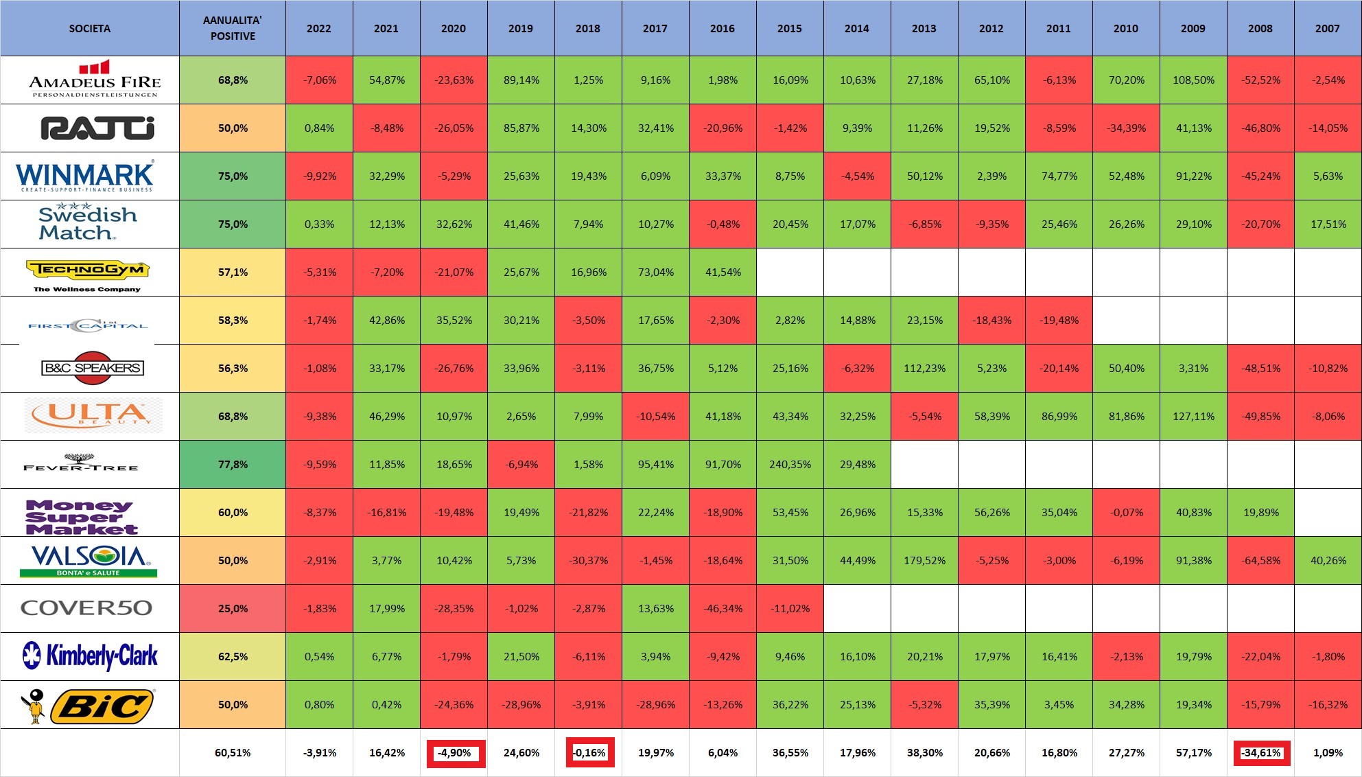 Nella tabella sono indicati gli andamenti realizzati in ogni anno tra il 2007 ed il 2022. Su 195 “annualità” se ne registrano 118 positive (60,5%).