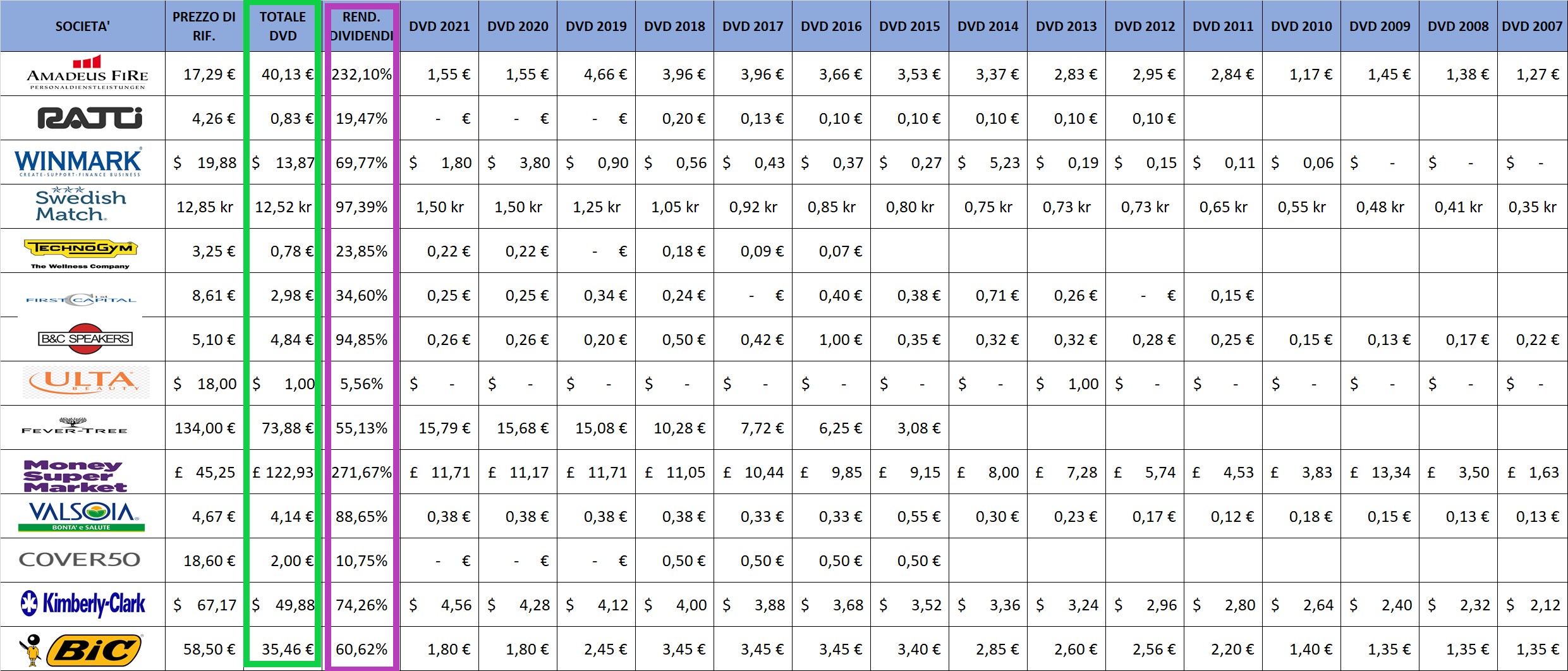 Nella terza colonna (evidenziato in verde) viene indicato il totale complessivo dei dividendi corrisposti agli azionisti nel periodo considerato. La quarta colonna (evidenziata in viola) riporta, a titolo puramente esemplificativo, il rendimento % del totale dei dividendi incassati rapportati al valore di carico.