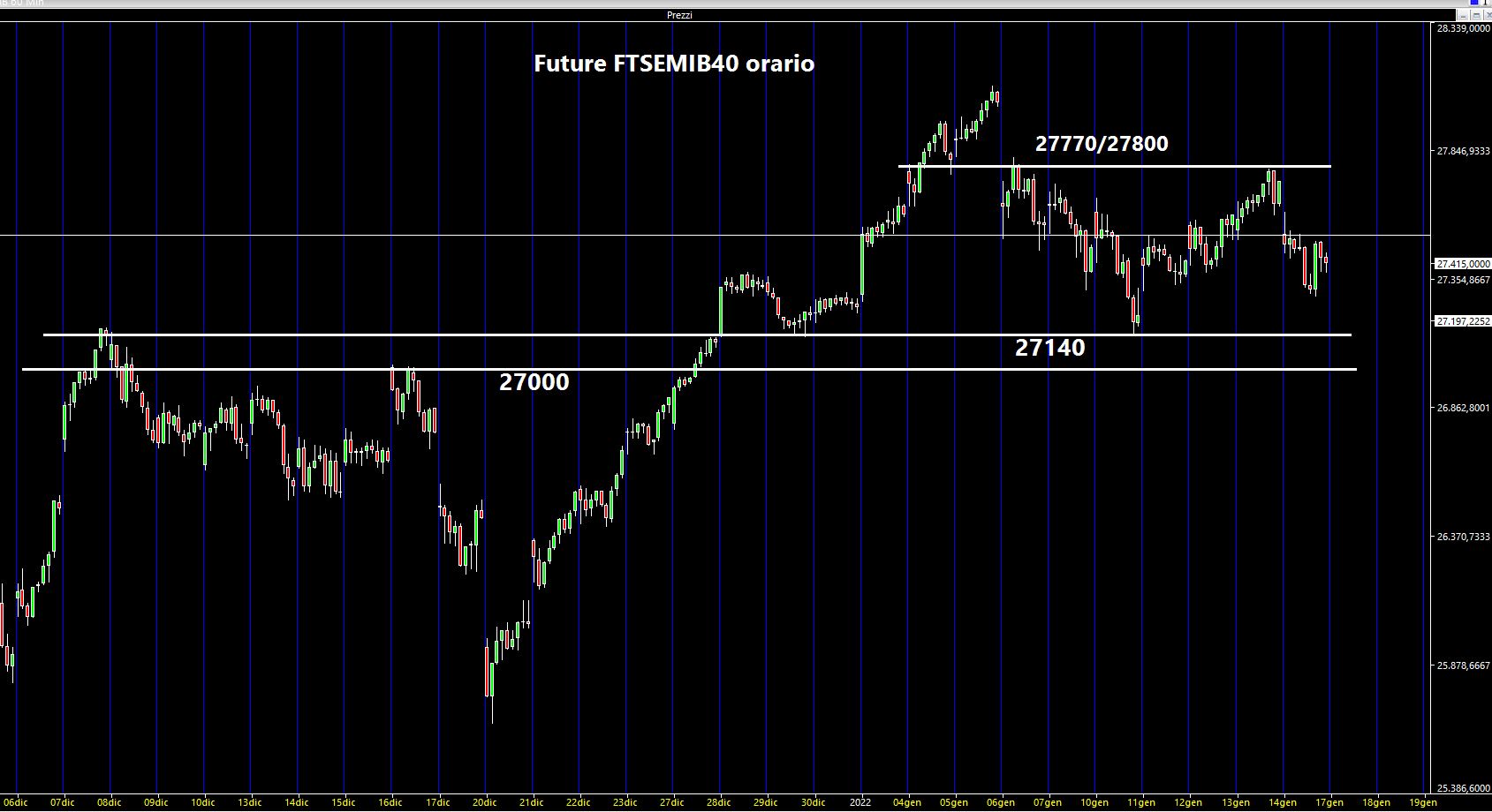Osservando un grafico orario abbiamo una sorta di lateralizzazione in corso in cui personalmente non trovo molti spunti operativi a livello di derivato. Le resistenze al rialzo sono a 27770/27800 mentre il supporto principale al ribasso è collocato in area 27140 con una possibile estensione fino a 27000. All'interno di questa fascia faccio fatica a vedere aree "logiche" e quindi navigo a vista: i 27530 potrebbero essere un potenziale baricentro ma col beneficio del dubbio.