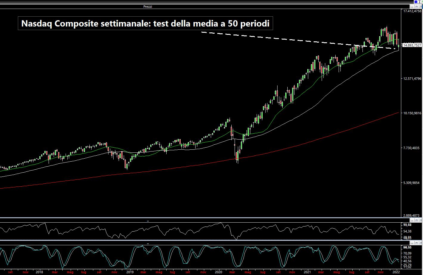 Estendendo lo sguardo agli Stati Uniti, in settimana per la prima volta da quasi due anni abbiamo avuto il "touch" della media a 200 periodi del Nasdaq Composite (colore rosso), ma si è trattato di un tocco avvenuto sia nella seduta di lunedì che di venerdì. E questo non capitava da febbraio 2020 (quando fu bucata al ribasso) e da aprile 2020 (quando fu bucata al rialzo).