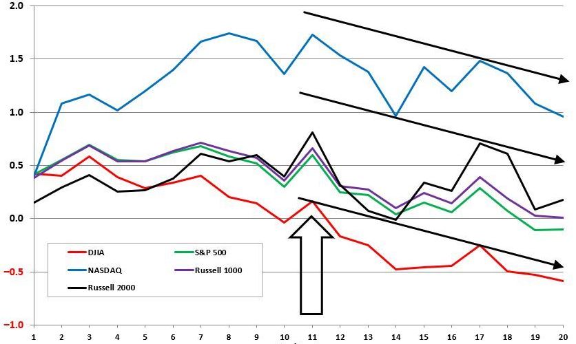La statistica mostra tuttavia che verso la metà di gennaio i mercati statunitensi si indeboliscono generalmente e quindi la cautela è più che mai d'obbligo: il rally natalizio tende a produrre una "coda" rialzista fino alla prima settimana di gennaio, poi mano a mano si riduce l'accelerazione del "boost". A dire il vero ci sono fattori molto specifici che influenzano questo dato e derivano da come il mercato si è comportato in precedenza, ma non entro nel merito.