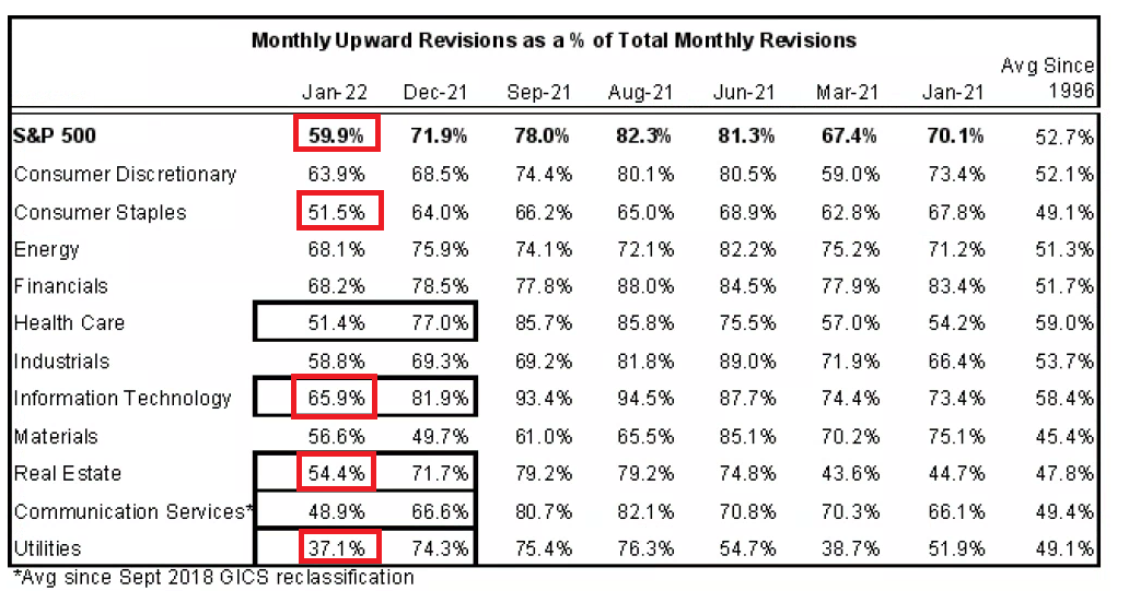 Come è andato il consenso nelle ultime settimane? Il monitor di Citigroup rivela una discreta discesa del ratio delle previsioni a Gennaio, con significative discese in molti settori e un crash delle utilities (v.grafico):