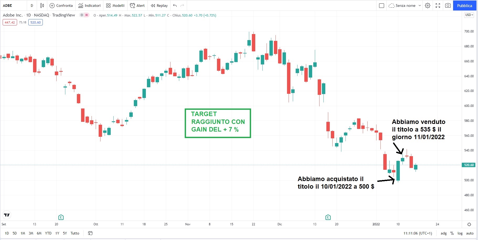Si tratta di ADOBE SYSTEMS, simbolo: ADBE, codice Isin: US00724F1012, titolo che abbiamo già imparato a conoscere in quanto già acquistato nel 2019 e nel 2021 con un gain del + 7 % entrambe le volte.