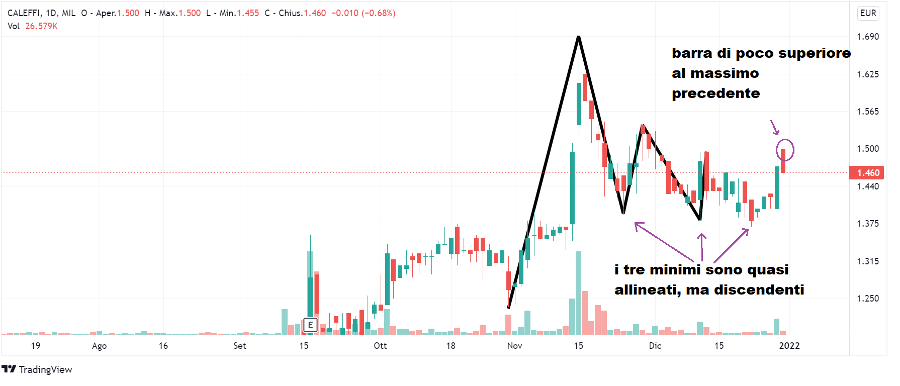 Da Renergetica a Caleffi (sabato Lombard Stock Index di 20), per parlare ancora dell’evoluzione grafica di un titolo già analizzato e per il quale nell’ultimo articolo avevamo ipotizzato la presenza di un triangolo discendente con due minimi praticamente allineati (1,39 – 24 novembre; 1,38 – 10 dicembre), tuttavia nella seduta del 22 dicembre è stato toccato un minimo ancora inferiore ai precedenti (1,37) ed il 30 dicembre la quotazione di 1,5 si è spinta, anche se di poco, sopra quello che poteva essere il terzo massimo decrescente di un triangolo.