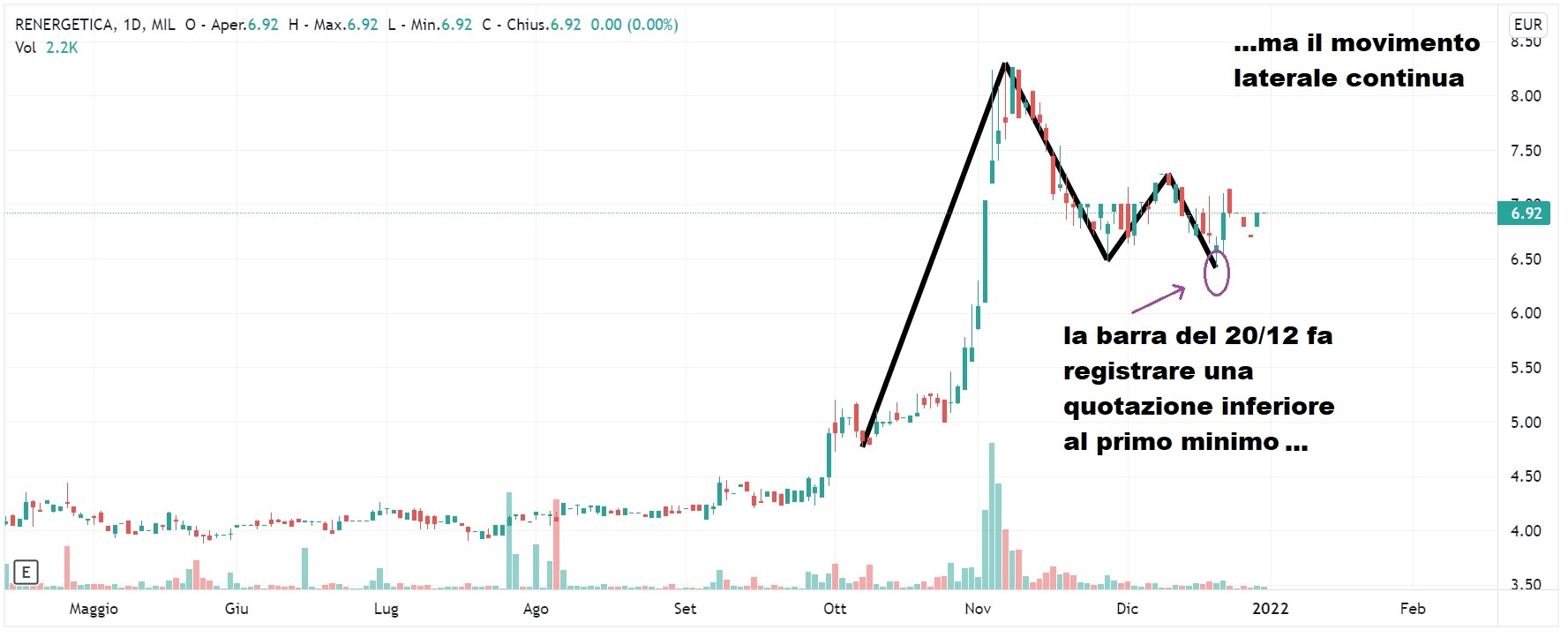 Iniziamo l’anno nuovo dando uno sguardo alla situazione grafica di due titoli già analizzati nel nostro ultimo articolo della rubrica dedicata al Lombard Stock Index; i titoli in questione sono Renergetica e Caleffi. La prima delle due, Renergetica (sabato Lombard Stock Index di 43) si trova ancora in una fase di movimento laterale, tuttavia è necessaria un’osservazione riguardo il triangolo che avevamo già segnalato. La figura, infatti, è stata rotta verso il basso il 20 dicembre con una quotazione di 6,42, minimo più basso del primo di 6,48 (26 novembre). Come già detto, però il movimento laterale pare persistere e nelle sedute successive non sono stati registrati minimi inferiori a quello del 20 dicembre (e nemmeno a quello del 26 novembre).