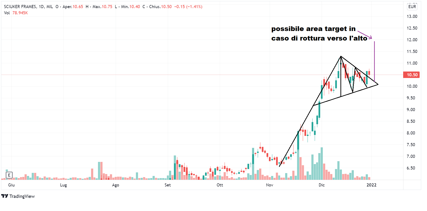 Le due novità con le quali apriamo il 2022, invece, le troviamo in cima alla lista proposta sabato dal Lombard Stock Index, in piena “TOP 10”. Sciuker Frames presenta un Lombard Stock Index di 56, ovvero il quarto più elevato nella lista di sabato. Segue, e nemmeno troppo a distanza, Wiit, che con il suo Lombard Stock Index di 48 è in “sesta posizione” nella lista di sabato. Prendiamo in considerazione l’impostazione grafica di questi due titoli.