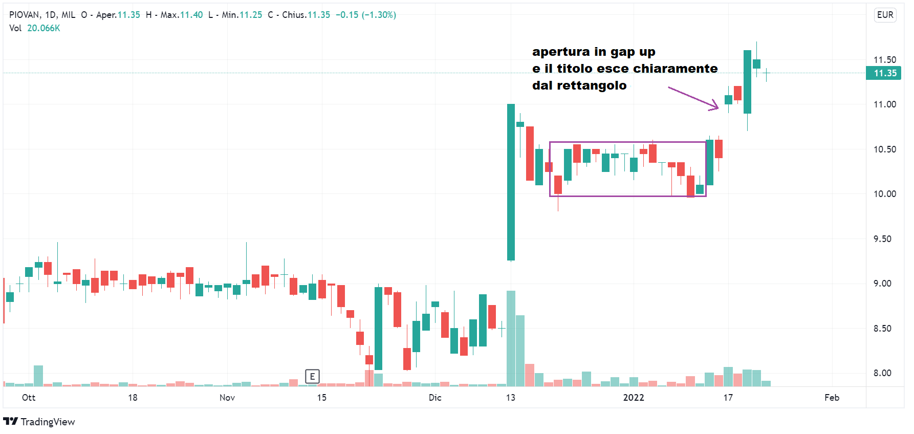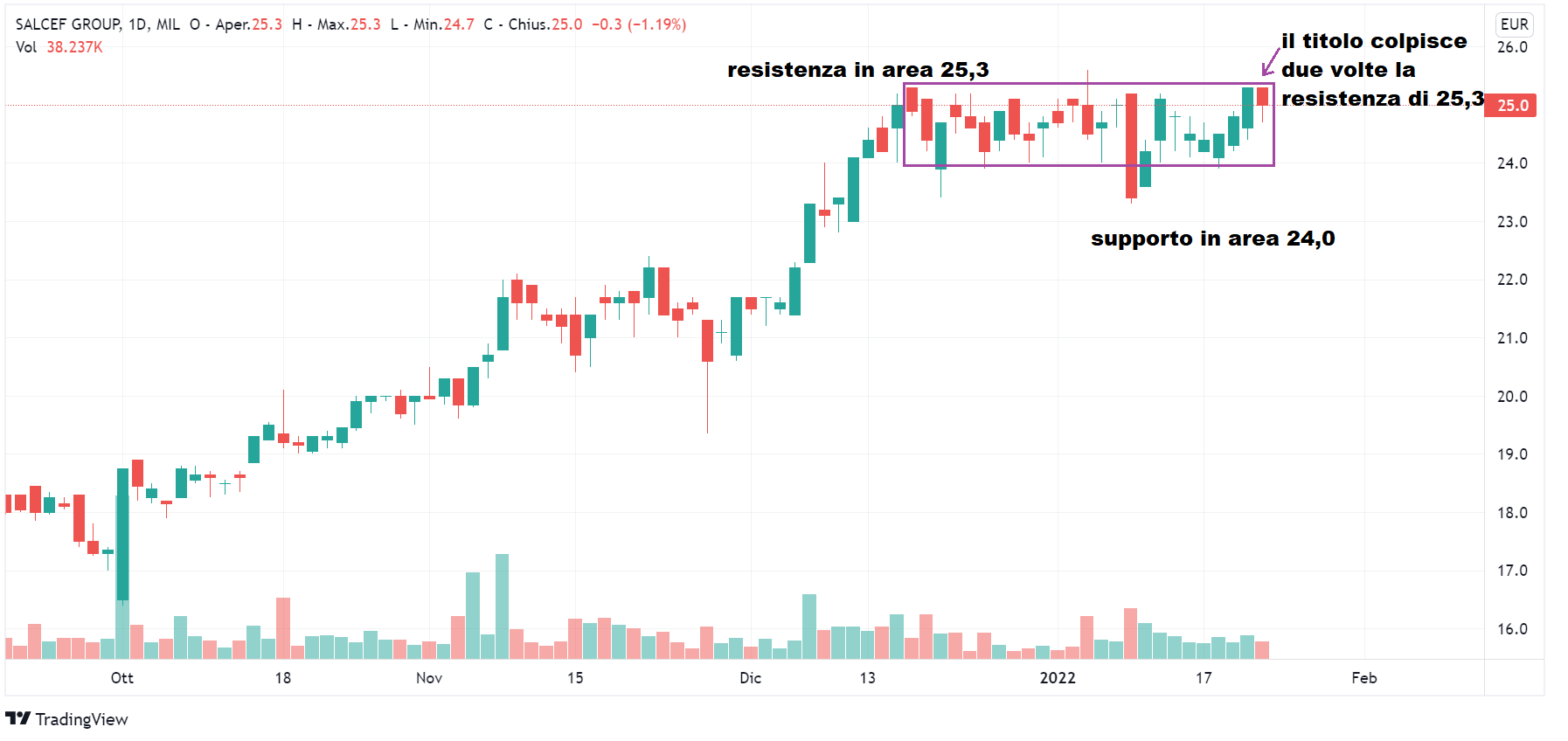 Un rettangolo resiste, l’altro viene rotto verso l’alto. Per la nostra analisi settimanale riprendiamo due figure presenti anche nel nostro ultimo articolo ed individuate sui grafici di Salcef Group e Piovan. Della prima delle due, Salcef Group (venerdì Lombard Stock Index di 38), ormai parliamo da tre settimane consecutive ed il titolo continua a muoversi all’interno di un rettangolo. Nelle ultime due sedute, 20 e 21 gennaio, il prezzo è andato a sbattere contro la resistenza a 25,3; il 20 gennaio con una chiusura forte, il 21 invece il titolo ha toccato in apertura la resistenza, per poi scendere. Nel lato basso del rettangolo i prezzi si sono concessi solo una leggera escursione sotto il supporto di area 24,0, nella seduta del 18 gennaio quando è stato toccato un minimo di 23,9. Il rettangolo regge, la lateralizzazione continua.