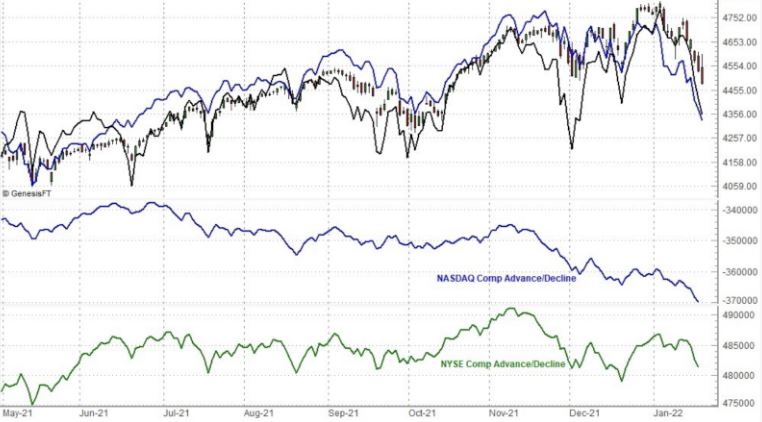 Finalmente la situazione si è sbloccata ed abbiamo avuto un bel ribasso su uno dei principali indici al mondo. Ovviamente questo non era l'unico alert, penso ad esempio a quanto da me scritto la settimana scorsa (link: https://www.lombardreport.com/2022/1/15/prova-6/) in cui evidenziavo la perdita di momentum che si verifica statisticamente a partire dalla seconda metà di gennaio, in cui il "boost" rialzista del rally di Natale perde mano a mano forza. Vogliamo poi parlare della "danza" del Nasdaq attorno alla sua 200 ?