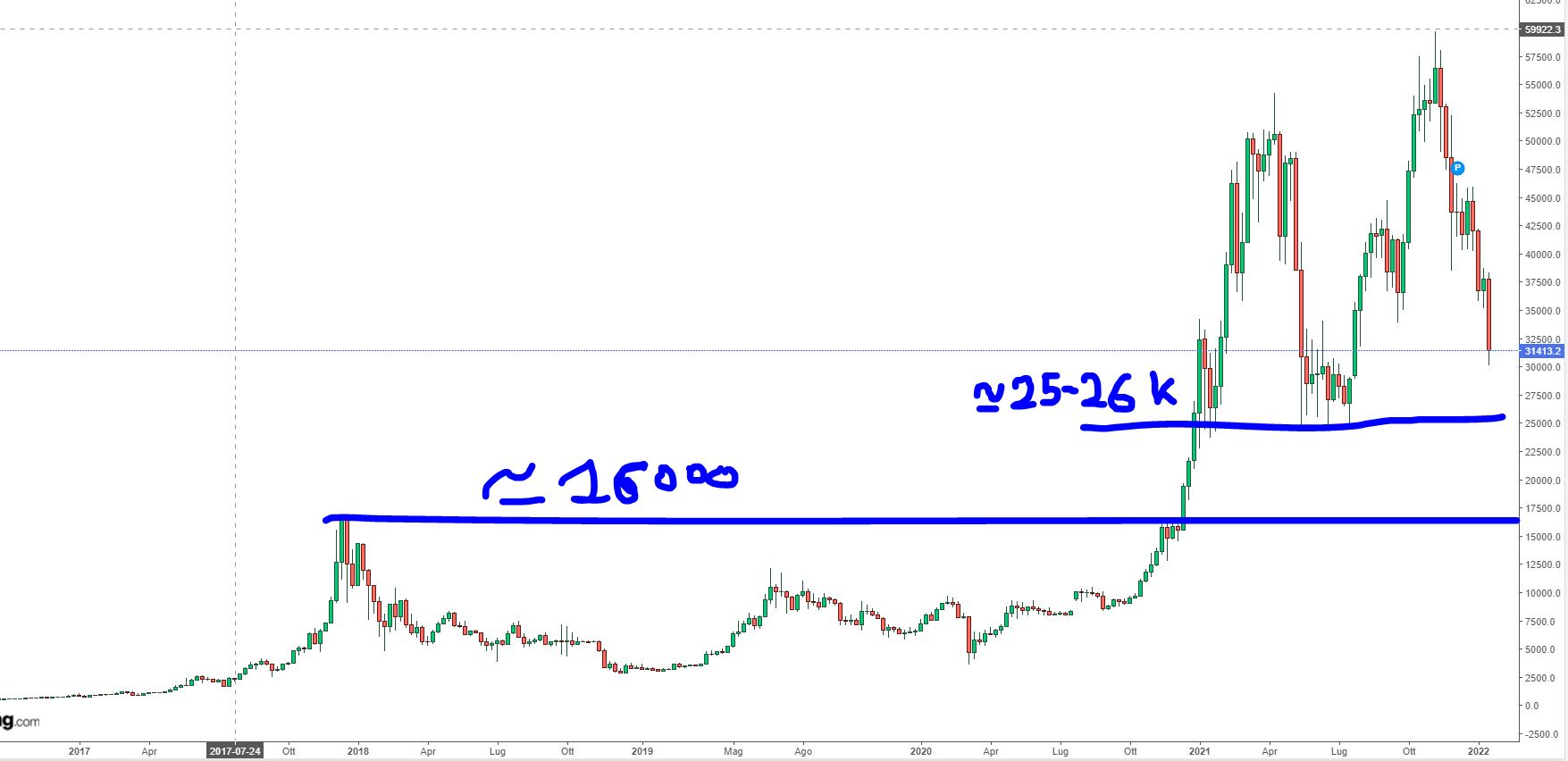 Nel mio primo articolo di gennaio (link: https://www.lombardreport.com/2022/1/5/attenzione-ribasso-probabile-su/) segnalavo la possibiltà di un deciso ribasso alla rottura dei 40000 contro euro. Altrettanto onestamente il target era a 36000. Il 13 gennaio, in un nuovo articolo, ho tuttavia postato questo grafico (link: https://www.lombardreport.com/2022/1/13/la-discesa-stata-veloce-il-target-attorno-al-10-centrato-in-tre-sedute-ma-adesso-attenzione/).