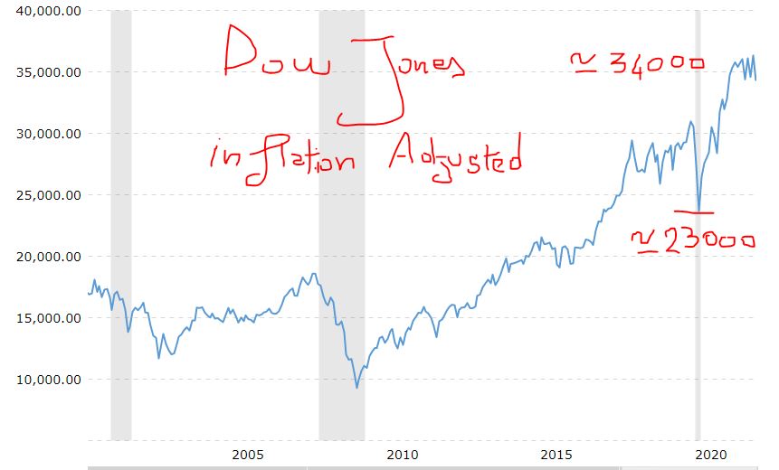 Tornando al discorso dell'inflazione, sappiamo che il Dow Jones è passato dai 18500 del minimo di marzo 2020 ai 34000 punti attuali: +75% circa. Se però vi postassi il grafico inflation adjusted la salita è attorno al +45%!