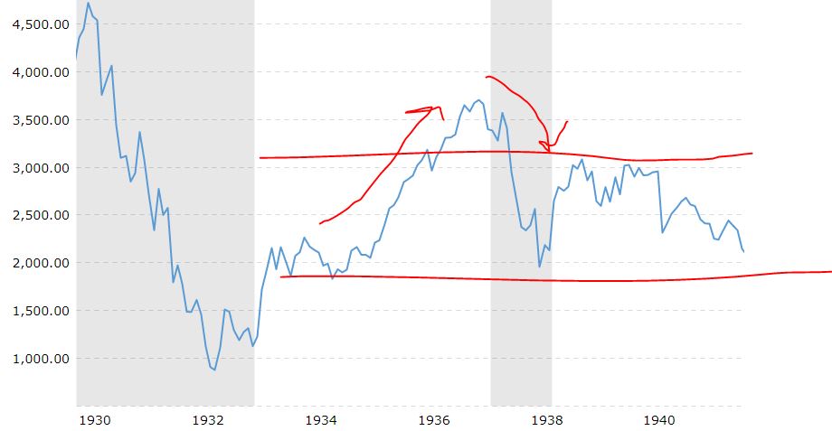 Pensate ad esempio che pochi anni dopo la crisi del 1929 vennero alzate drasticamente le tasse e negli anni immediatamente successivi il mercato andò in laterale (di svariati punti percentuali, attorno ai 1000 punti, ma al tempo ne valeva solo 3500!). Di seguito trovate il grafico con l'aumento della tassazione e poi quello relativo al comportamento del Dow Jones negli anni '30.