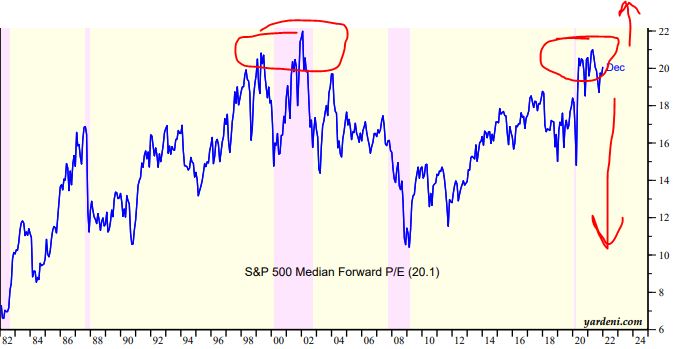 Altro fattore da non sottovalutare a mio avviso è quello dei farward sul rapporto prezzo utili attesi che è a ridosso dei massimi del 2000. Chiaramente questo non ci dice che ci debba essere un crash di mercato ma solo che i margini (probabilità) di salita dell'indicatore sono inferiori a quelle di una sua discesa (frecce rosse).
