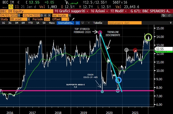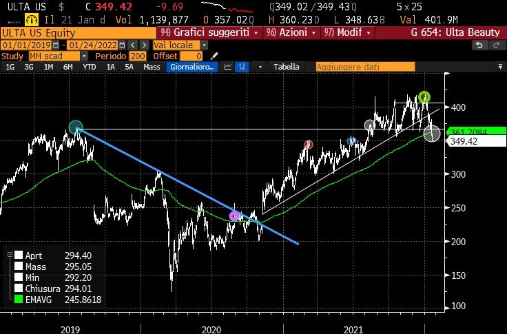 Dopo aver raggiunto i massimi storici a fine 2021, il titolo ha ripiegato. L’ultimo impulso ribassista ha portato le quotazioni al di sotto della media mobile a 200 giorni.
