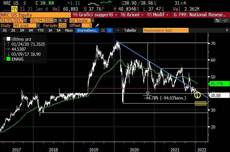 Dopo la rottura dal supporto a quota $ 40, il titolo sembrava destinato a raggiungere rapidamente i minimi realizzati nel crash di febbraio 2020. Non è affatto escluso che ciò non succeda: ai fini della strategia potrebbe rappresentare una grande opportunità per acquistare un ottimo titolo a prezzi più contenuti. Rimaniamo in attesa ma molto vigili.