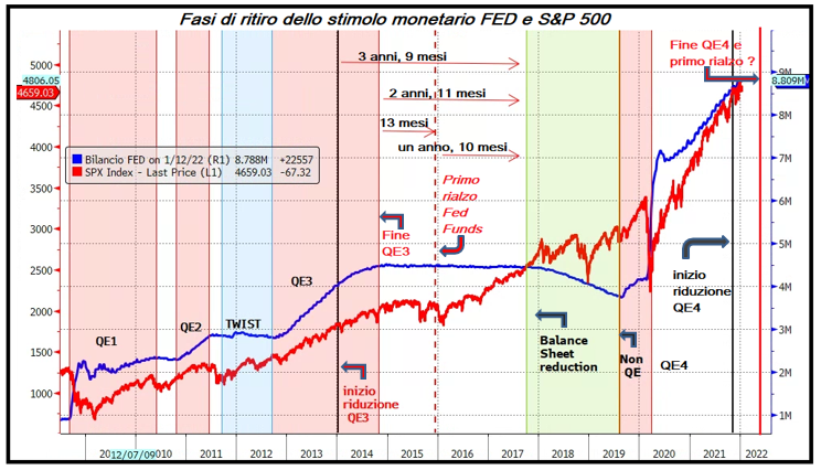 D'altronde, l'ammontare di tightening che il mercato deve sobbarcarsi è significativo. Nel 2013, come si nota dal grafico sotto, tra l'inizio del tapering e l'inizio della riduzione del bilancio FED erano passati quasi 4 anni. Tra la conclusione del tapering e il primo rialzo 13 mesi. Il programma attuale della Fed prevede ora circa 12 mesi per svolgere il tutto, e un primo rialzo dei Fed Funds contestuale alla fine del tapering. Tappe forzate, decisamente. Un po' di turbolenza ci sta (v. grafico):
