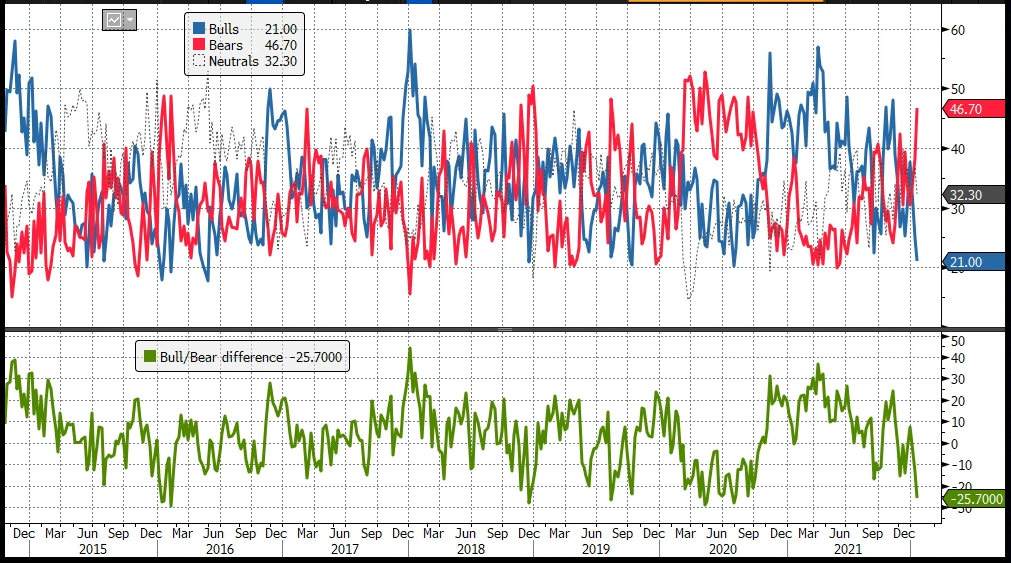 Di sicuro il sentiment comincia ad accusare questa volatilità persistente, in un anno che sembrava partito sotto i migliori auspici (record storico direttamente il 3 Gennaio). Ad esempio il seguente grafico sul sondaggio AAII mostra il minor numero di “tori” da giugno 2020 e la maggior differenza a favore degli “orsi” da settembre 2020: