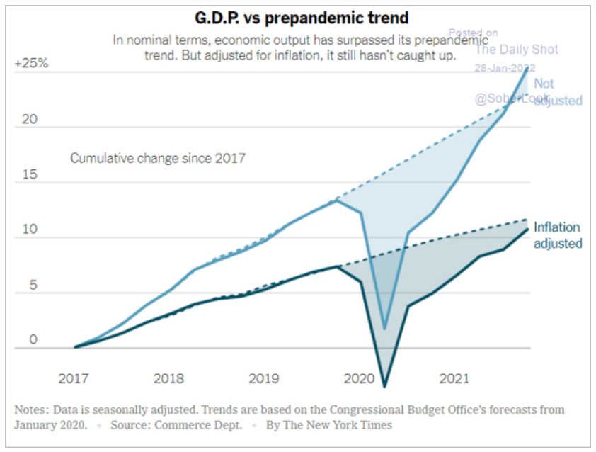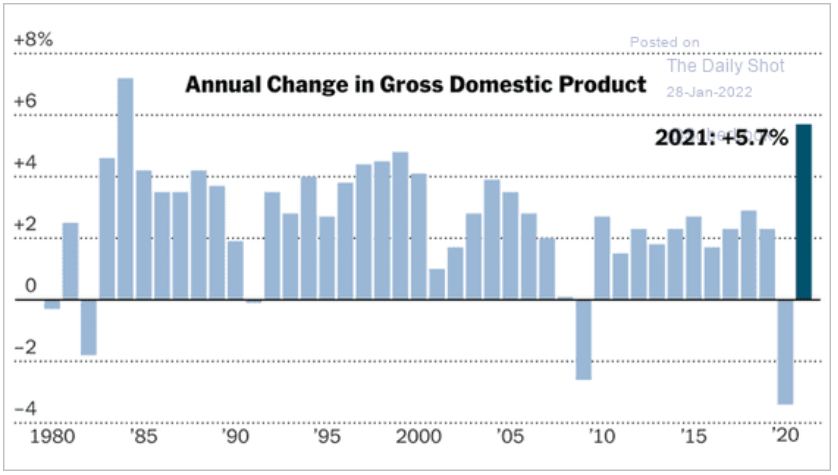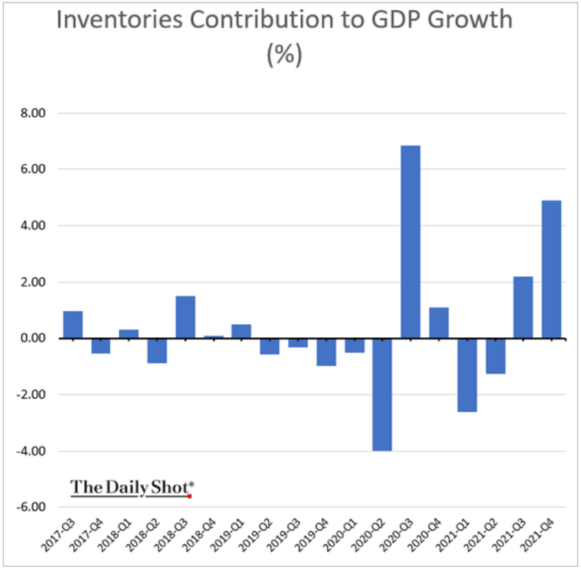 E’ incredibile come ormai il concetto stesso di stampa finanziaria sia superato dalla velocità con cui si diffondono le informazioni e soprattutto i prezzi. Capita di vedere siti o giornali che per 24 o 48 ore tengono postati articoli aggiornati alle ore 17.30 del venerdì pomeriggio, chiusura della Borsa italiana, con visioni negative dell’andamento dei prezzi quando in realtà alle ore 22.00 dello stesso venerdì Wall Street ha chiuso in maniera entusiastica. Quello che manca è la visione grafica d’insieme unita alle informazioni di tipo macro che quotidianamente colpiscono i mercati, è vero, ma hanno una caratteristica: sono monotematiche, monotematiche come le preoccupazioni dei market players che oscillano sempre entro alcuni limiti ben definiti in un intervallo di tempo di settimane. Ad esempio ora ci si chiede se la crescita del PIL Usa continuerà nello stesso modo anche nel 2022 e la preoccupazione non è tanto sulla crescita in sé perché come dimostra il grafico che segue questa è superiore a quella che abbiamo visto negli ultimi 40 anni quanto sulle componenti della crescita stessa, che al momento è stata guidata esclusivamente dagli incrementi dei magazzini ma non dagli acquisti dei consumatori: