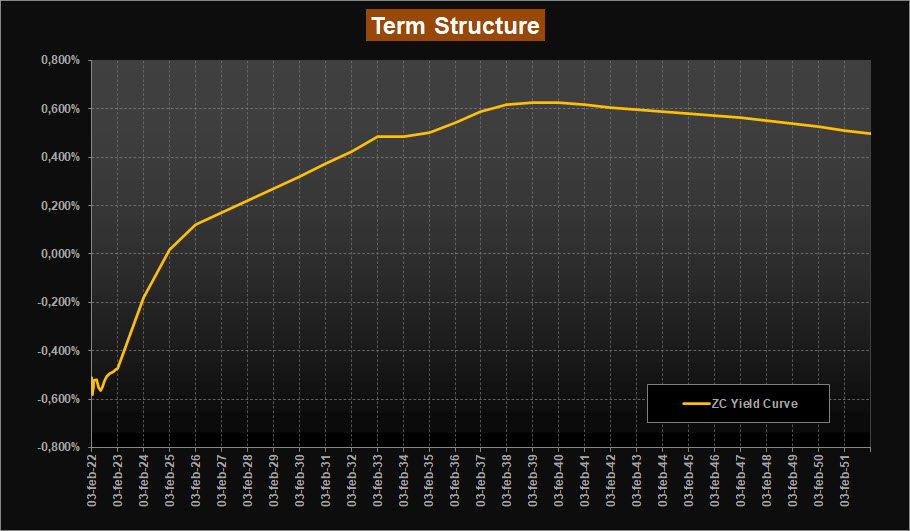 La lettura della ZC-Yield Curve mostra un lieve aumento dei rendimenti, ma non in modo omogeneo su tutto il tratto della curva. Infatti, rispetto alla scorsa analisi il rendimento della scadenza a 10 anni ritocca leggermente al rialzo portandosi in area 0,42% rispetto a poco meo dello 0,40% precedente, mentre la scadenza trentennale è in leggera contrazione e ora in area 0,50% rispetto allo 0,53% precedente. Si modifica anche la conformazione della curva, con la parte a breve e medio sempre con inclinazione positiva molto marcata, ma con un’accentuazione dell’inclinazione negativa per le scadenze dal 2040 in poi. La curva evidenzia ora un massimo di rendimento sulle scadenze 2039-2040, in lieve aumento rispetto alla scorsa analisi, passando all’attuale area 0,63% dal precedente 0,60% di rendimento. Nervosi i tassi forward su Euribor 6 mesi sia sul tratto a breve sia su quello a lunga. Ora la curva fornisce previsione di tassi positivi nel 2023 contro la precedente lettura stimata per il 2024; la parte a breve è ancora più ripida con una forte accelerazione nell’intervallo 2023-2024. In salita anche il tratto a lunga con una serie di due picchi tra area 1,10% e area 1,20%.