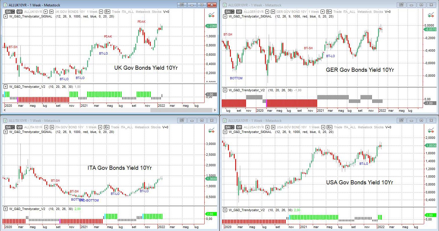Osservando – a livello di analisi integrata – le curve dei rendimenti dei principali benchmark decennali, il quadro si mostra conforme a quanto osservato nella scorsa analisi su tutte le aree valutarie, con la conferma degli importanti allargamenti dei rendimenti sui benchmark decennali. Il modello Trendycator non ha ancora segnalato variazioni ma, come osservavamo nello scorso articolo, la dinamica dei grafici suggerisce che potremmo avere a breve indicazioni di cambio a livello strategico. L’area UK, dopo l’esplosione dei rendimenti avvenuta tra fine 2021 e inizio 2022 si è ora assestata con i rendimenti del GILT che hanno frazionalmente superato area 1,20%, segnando nuovi massimi e con Trendycator ancora in stato NEUTRAL. Anche il BUND sta consolidando la robusta salita dei rendimenti delle scorse settimane ed anzi, ha pure registrato un fugace test in area positiva, cosa che non si vedeva da tempo; il rendimento del decennale tedesco si attesta ora in area -0,05% con modello Trendycator sempre in stato NEUTRAL. Consolidano la salita anche i rendimenti del nostro Btp che si porta ora in prossimità di area 1,40% con un test a 1,50% prima delle elezioni bis del presidente Mattarella, con Trendycator che consolida lo stato LONG ormai da oltre due mesi. Infine, l’area USA che non fa eccezione, con i rendimenti del Treasury decennale che hanno conquistato area 1,80% superando anche marginalmente tale soglia e con Trendycator che ha cambiato stato ed ora LONG.