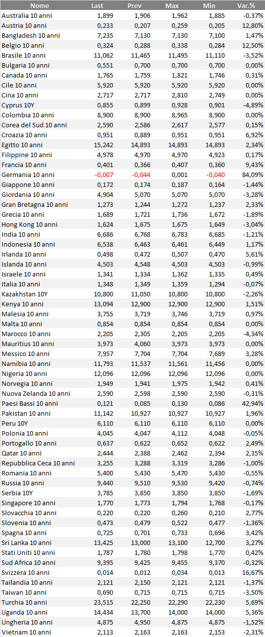 Consueta sezione dell’analisi sui mercati obbligazionari, con l’introduzione sotto forma di ranking dei bond governativi mondiali con qualunque rating. In alcuni casi, per alcuni emittenti o per alcune valute, il rapporto rischio/rendimento di questi bond può essere anche piuttosto speculativo. Il ranking considera i bond benchmark decennali in tutte le valute di emissione.