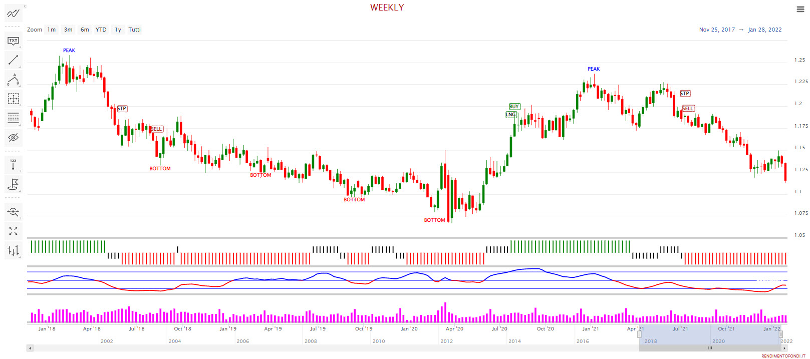 Infatti, dopo aver esaurito la fase di consolidamento nell’intervallo 1,12-1,14 (seguita alla composta discesa che lo ha portato dai massimi di fine maggio 2021 in area 1,22 sino al minimo poco sotto area 1,12), il cambio ha rotto gli indugi e ha sfondato il supporto in area 1,12 per affondare verso area 1,10.